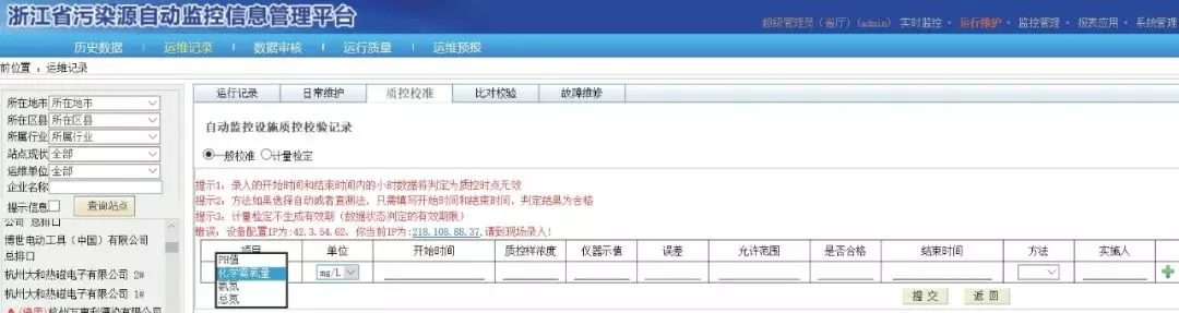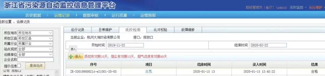 ?單機調試合格信息報備路徑為“運行維護”→“運維記錄”→“質控校準”,點擊“錄入”,進入表單,填寫最新的結果。