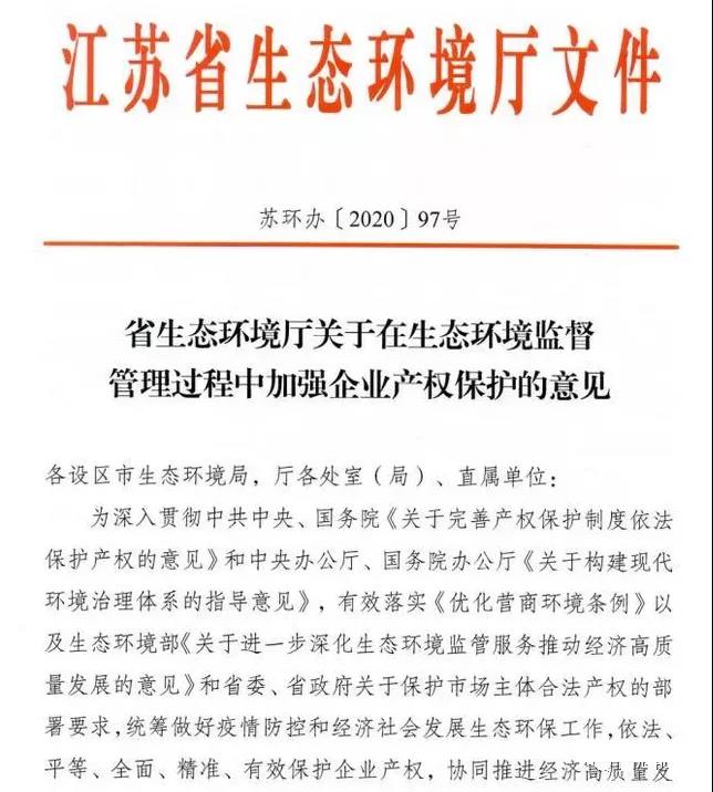 江蘇省生態(tài)環(huán)境廳已發(fā)布了《關(guān)于在生態(tài)環(huán)境監(jiān)督管理中加強(qiáng)企業(yè)產(chǎn)權(quán)保護(hù)的意見》,通過不干擾守法企業(yè)保護(hù)企業(yè)產(chǎn)權(quán)。免除對(duì)標(biāo)企業(yè),全面禁止環(huán)境保護(hù)"一刀切“。