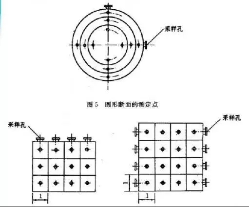 對圓形煙道,采樣孔應設在包括各測點在內的相互垂直的直徑線上(如下圖所示)。對矩形或方形煙道,采樣孔應設在包括各測點在內的延長線上(如下圖所示)。