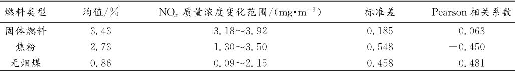 因此,在探討固體燃料類型對NOx排放的影響規(guī)律時(shí),將固體燃料比例固定,研究焦粉和無煙煤的比例變化對煙氣NOx排放的影響規(guī)律。根據(jù)固體燃料比例樣本數(shù)據(jù)的分布規(guī)律,選取具有代表性的固體燃料比例為3.3%~3.5%的樣本數(shù)據(jù)進(jìn)行相關(guān)性分析研究,結(jié)果見表3。